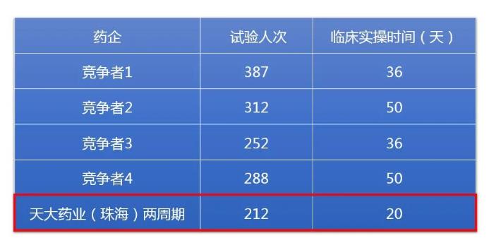 比照其他竞争敌手,天大药业的一致性评价试验确着实时间和用度本钱上占有显着优势。