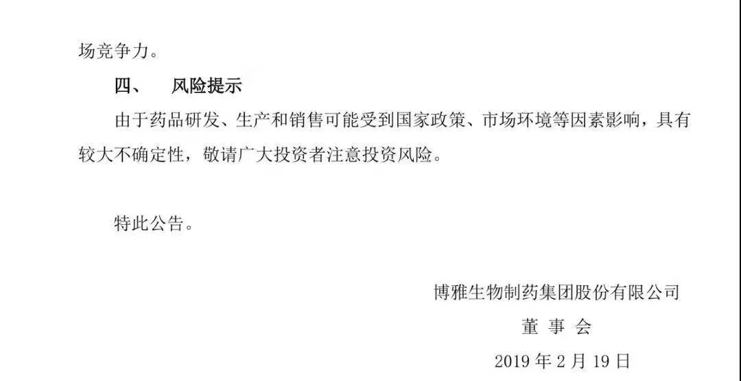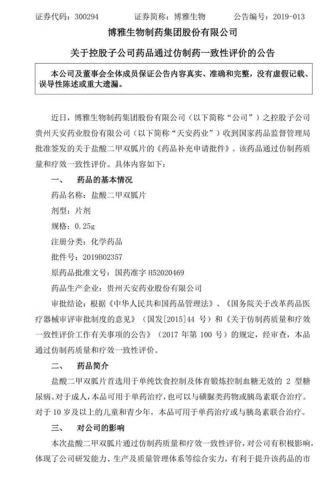 2019年2月19日,博雅生物制药集团股份有限公司通告其控股子公司贵州天安药业股份有限公司(以下简称“天安药业”)收到国家药品监视管理局批准签发的关于盐酸二甲双胍片的《药品增补申请批件》。该药品通过仿制药质量和疗效一致性评价。