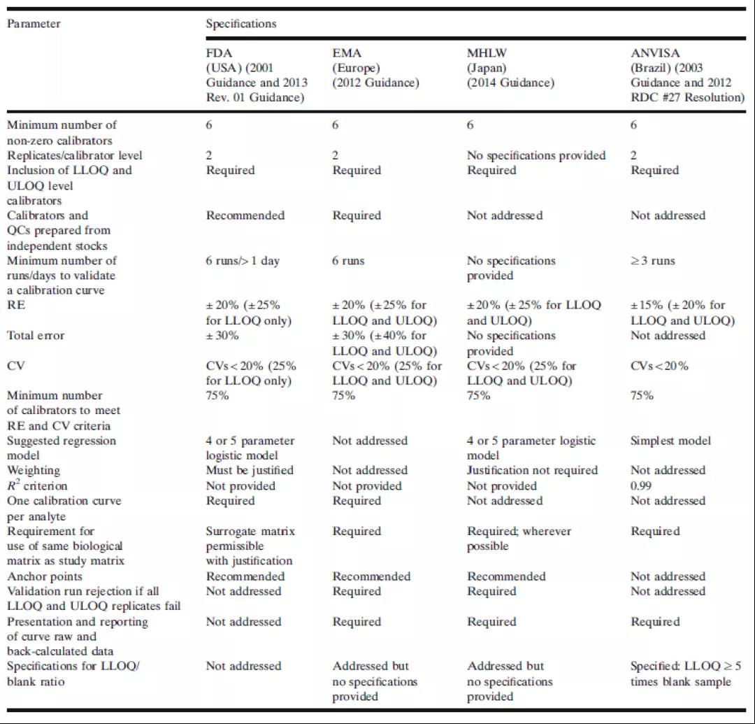 Ä¿½ñ£¬Ò»Ð©ÉúÎïÆÊÎöÖ¸ÄÏ»ò¹æÔòÎļþµÄÉúÎïÆÊÎö²¿·ÖÒѾ­¶ÔУ׼±ê×¼ÇúÏßµÄ×îµÍÒªÇó¾ÙÐÐÁËÈ·¶¨¡£ÕâЩָµ¼ÐÔÎļþ¶ÔLBAÇúÏßµÄÐèÇóºÍÐÔÄÜÔ¤ÆÚͨ³£ÊÇÏ໥һֵġ£±í1×ܽáÁËÀ´×ÔÃÀ¹úʳÎïºÍÒ©Îï¹ÜÀí¾Ö(FDA)¡¢Å·ÖÞÒ©Æ·¹ÜÀí¾Ö(EMA)¡¢ÈÕ±¾ÎÀÉú¡¢ÀͶ¯ºÍ¸£Àû²¿(MHLW)ºÍ°ÍÎ÷ÎÀÉúî¿Ïµ»ú¹¹(ANVISA)¶ÔУ׼ÇúÏßµÄÒªÇó¡£FDAºÍEMAÖ¸ÄÏÊǾø´ó´ó¶¼ÉúÎïÆÊÎöʵÑéÊÒ×ñ´ÓµÄÖ÷ÒªÖ¸ÄÏ¡£¸÷¸öÖÆÒ©³§ÉÌӦƾ֤¸÷×ÔÍýÏëËùÌá½»µÄÐÂÒ©ÉóºËî¿Ïµ»ú¹¹À´¾öÒé×ÔÉíÐèÒª×ñ´ÓµÄÖ¸ÄϹæÔò¡£