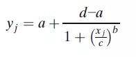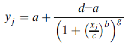 ÆäÖÐyjÊǶÔӦŨ¶ÈxjµÄÏìÓ¦£¬aΪÉϽ¥½üÏߣ¬dΪϽ¥½üÏߣ¬cΪÇúÏ߹յ㴦µÄŨ¶È£¬bΪÉú³¤Òò×Ó¡£¸ÃÄ£×ÓµÄÒ»¸öÌØµãÊǹյãÖÜΧµÄ¶Ô³ÆÐÔ£¬¶ø¹Õµã¶ÔÓ¦ÓÚdºÍaÖ®¼ä¾àÀëµÄÒ»°ë¡£Õâ¸öÄ£×ÓËäȻҲ¿ÉÓ¦Ó㬵«Ëüͨ³£±¬·¢µÄÊÇÒ»¸ö²î³Ø³ÆµÄУ׼ÇúÏߣ¬Òò¶øÐèҪʹÓÃ5PLÄ£×ÓÄâºÏ¡£