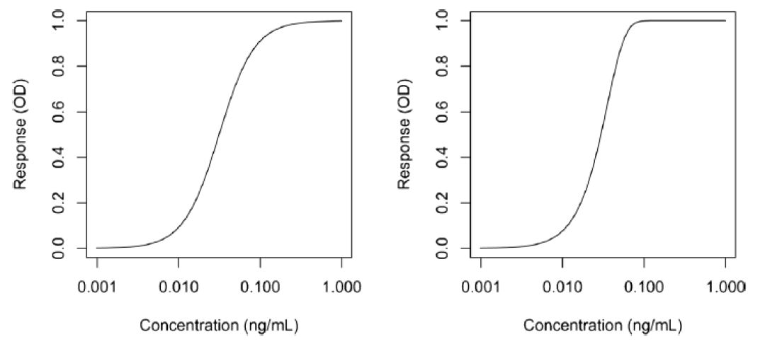 ͼ2. °´4²ÎÊýÂß¼­Ä£×Ó£¨4PL£¬×󣩺Í5²ÎÊýÂß¼­Ä£×Ó£¨5PL£¬ÓÒ£©ÄâºÏµÄУ׼ÇúÏß¡£Í¼ÖУ¬ÒÇÆ÷ÏìӦΪ¹âѧÃܶȣ¨OD£©,YÖá;У׼ÑùƷŨ¶È£¨Ã¿ºÁÉýÄɿˣ¬ng/mL£©£¬XÖá¡£ÒÔ¶ÔÊý¿Ì¶ÈΪµ¥Î»¡£