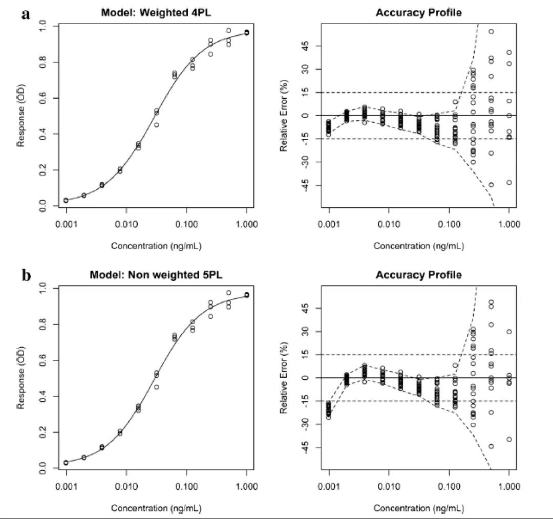 ͼ4. Ä£×ÓÄâºÏ£º¼ÓÈ¨ÖØÓëÎÞÈ¨ÖØµÄ½ÏÁ¿¡£LBAµÄУ׼ÇúÏߺÍÏà¹ØµÄ׼ȷ¶ÈÇúÏߣ¨a¶¥²¿£¬bµ×²¿£©¡£a ¼ÓȨ4PLÄ£×Ó¡£b ÎÞ¼ÓȨ5PLÄ£×Ó¡£ÒÇÆ÷ÏìӦΪ¹âѧÃܶȣ¨OD£©,YÖá;У׼ÑùƷŨ¶È£¨Ã¿ºÁÉýÄɿˣ¬ng/mL£©£¬XÖá¡£ÐéÏßÅþÁ¬ÏºÍÉÏ-Ô¤ÆÚÈݲîÇø¼ä£¬Í¨Ë×ʵÏßÊǽÓÊܼ«ÏÞ¡£ÕâÁ½¸öÄ£×ÓÈÔÈ»ºÜÏàËÆ£¬µ«4PLÔÚµÍŨ¶ÈÏÂÄÜÌṩ¸üºÃµÄ»ØËãÕ¹Íû¡£4PLÄ£×ÓµÄR2Ϊ0.9949137£¬5PLÄ£×ÓµÄR2Ϊ0.9949457£¬µ«4PLÄ£×ÓÌṩÁ˸üºÃµÄ»ØËãÕ¹Íû¡£²Ð²îÆÊÎöËùÐèµÄÌØÕ÷ÊÇËæ»úÂþÑÜ£¬ÔÚµÍŨ¶È»ò¸ßŨ¶ÈÉÏÎÞÆ«ÖᣱðµÄ£¬ÐèÒªÌØÊâ×¢ÖØÇúÏߵĵͻò¸ßˮƽ²¿·Ö£¬Õâ¿ÉÄܵ¼Ö¹ý¸ß»ò¹ýµÍµÄ¶¨Á¿Ð§¹û¡£