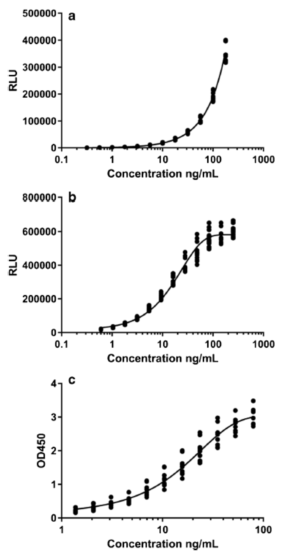 ͼ2. 3¸ö°¸ÀýÑо¿ÖеÄУ׼ÇúÏߣº°¸Àý A£¨a£©£¬°¸Àý B£¨b£© ºÍ°¸Àý C£¨c£©¡£¸ÃͼչʾÁË3Ìõ±ê×¼ÇúÏßµÄÐÎ×´£¬´ú±íÁËÔÚLBA²âÊÔÖÐͨ³£ÊӲ쵽µÄµä·¶·ÇÏßÐÔÏìÓ¦¡£XÖá´ú±íУ׼µãŨ¶ÈµÄ¶ÔÊý£¬YÖá´ú±íÏìÓ¦¶ÁÊý£º°¸ÀýAºÍBÊÇÏà¶Ô¹âµ¥Î»£¨RLU£©£¬°¸ÀýCÊÇ450 nM ¹âѧÃܶȣ¨OD 450£©¡£