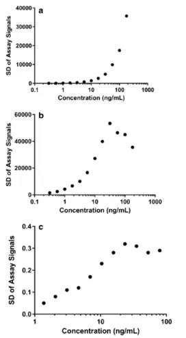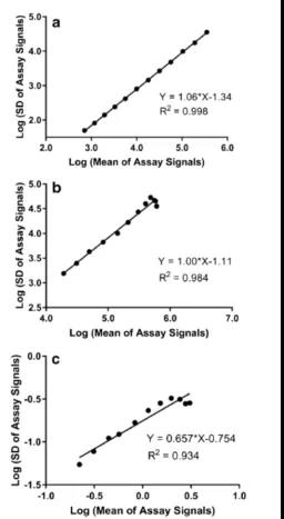ͼ3. °¸ÀýA£¨a£©¡¢°¸ÀýB£¨b£©ºÍ°¸ÀýC£¨c£©µÄÒì·½²îÐԸſö¡£XÖá´ú±íУ׼µãŨ¶ÈµÄ¶ÔÊý£¬YÖá´ú±íʵÑéÔËÐÐÖвâÊÔÐźŵÄSD¡£
