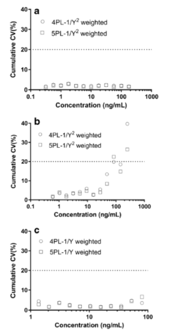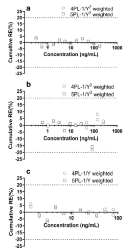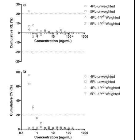 ΪÁËÑéÖ¤ËùÑ¡Ôñ»Ø¹éÄ£×ÓºÍÈ¨ÖØº¯Êý£¬¿ÉÒÔ×öÆäËûÆÀ¹À¡£ÀýÈ磬ÔÚʹÓÃÈ¨ÖØº¯Êý֮ǰºÍÖ®ºó£¬¿ÉÒÔ½ÏÁ¿4PLºÍ5PLÄ£×ÓµÄ׼ȷ¶ÈºÍϸÃܶÈÐÐΪ¡£±¾Îĸø³öÁË4PLÓë5PL£¨ÎÞ¼ÓȨºÍ 1/Y2¼ÓȨ£©µÄÀÛ»ý %CV ºÍÀÛ»ý %RE µÄ½ÏÁ¿£¬ÀÛ»ý %REµÄ¿É½ÓÊܹæÄ£Îª¡À 20%£¬ÀÛ»ý %CV µÄ¿É½ÓÊܹæÄ£Îª¡Ü20%¡£