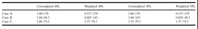 ±í2ÏÔʾ£¬Ê¹ÓÃÊʵ±µÄÈ¨ÖØº¯Êý¿ÉÒÔÀ©Õ¹ROQ¡£¶Ô°¸ÀýB£¬Ó¦ÓÃÈ¨ÖØº¯Êýµ½4PL»Ø¹éÄ£×Óºó£¬ROQ»ñµÃÏÔÖøÀ©Õ¹£»´Óδ¼ÓȨµÄ1.04-48.3 ng/mLµ½ ¼ÓȨµÄ0.602-145 ng/mL£»¼ÓȨ5PLÄ£×ÓµÄROQ£¬Ôò´Óδ¼ÓȨ1.04-145 ng/mL±äΪ¼ÓȨµÄ0.602-48.3 ng/mL¡£¶Ô°¸ÀýC£¬4PLÄ£×ÓµÄROQÂÔÓÐÀ©Õ¹£º´Óδ¼ÓȨµÄ2.06-79.3 ng/mL£¬µ½¼ÓȨµÄ1.37-79.3 ng/mL¡£¹ØÓÚ5PLÄ£×Ó£¬Ê¹ÓÃÈ¨ÖØº¯ÊýºóROQûÓÐÔöÌí¡£